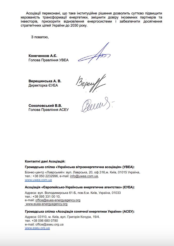 У цьому контексті професійна спільнота ВДЕ зробила важливий крок: Українська Вітроенергетична Асоціація, Європейсько-Українське Енергетичне Агентство та Асоціація Сонячної Енергетики України звернулися з офіційним листом до Президента України та Прем’єр-міністра з ініціативою призначення першого заступника Міністра енергетики з питань розвитку ВДЕ та розподіленої генерації.