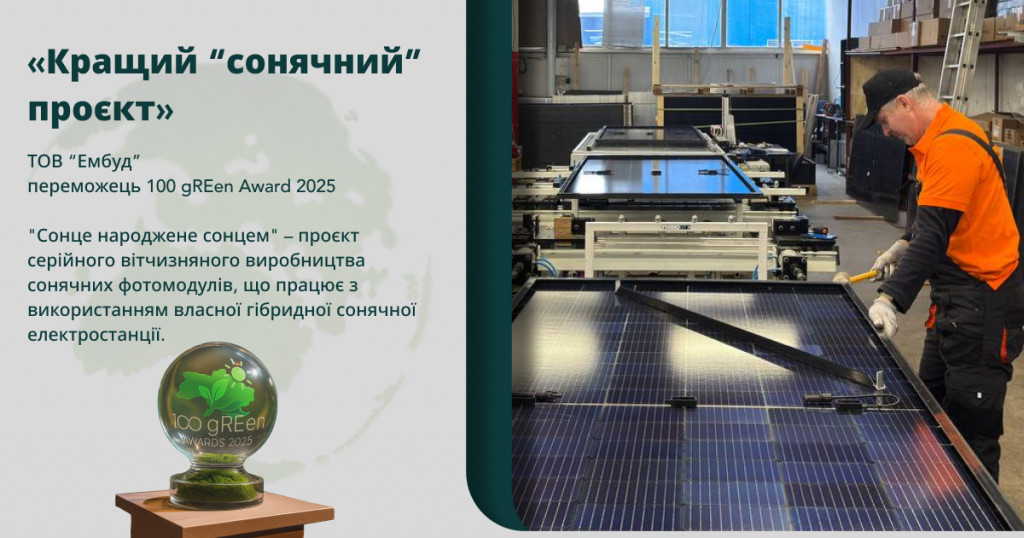 Переможець 100 gREen AWARD-2025 у категорії «Кращий “сонячний” проєкт: Сонце народжене сонцем» ТОВ “Ембуд”.